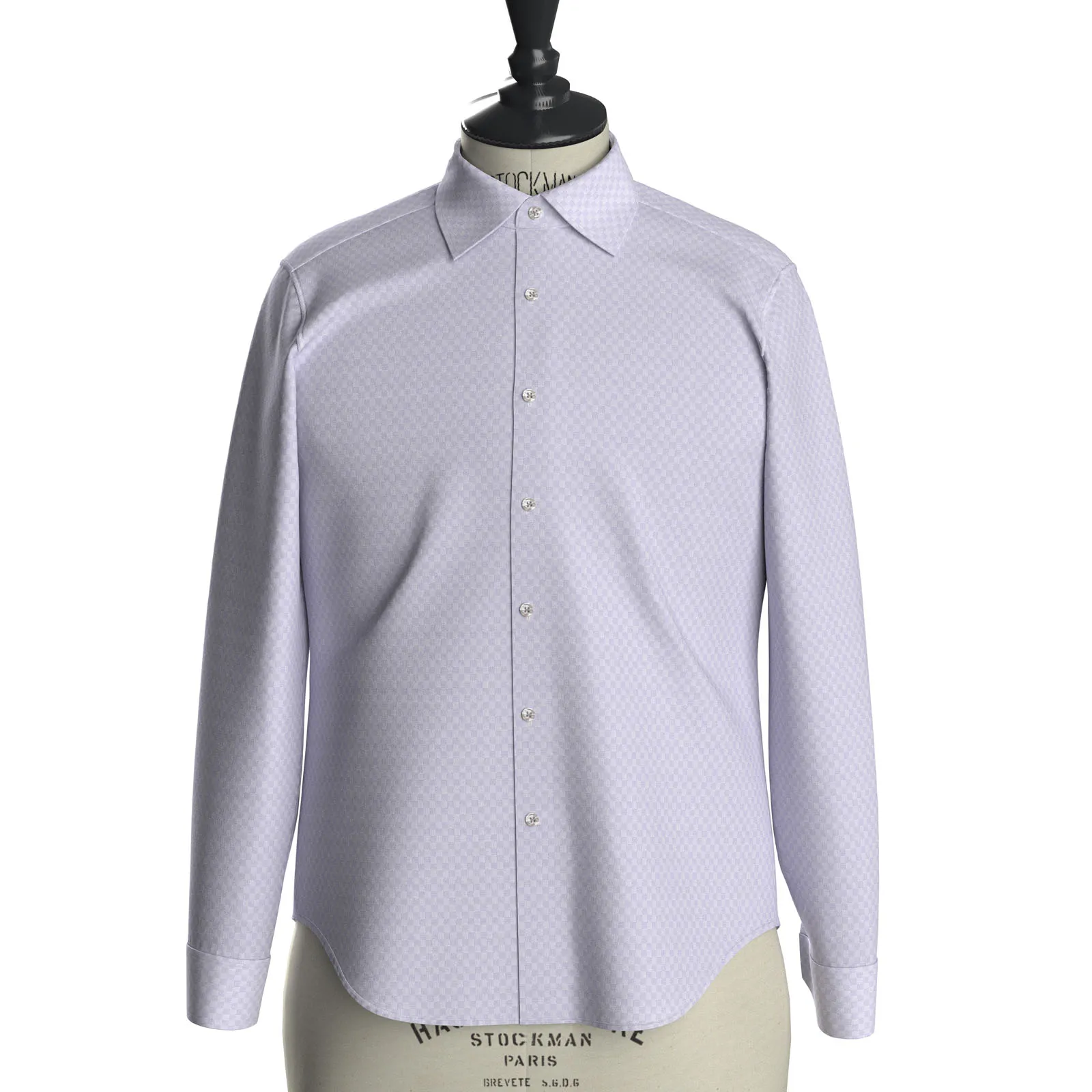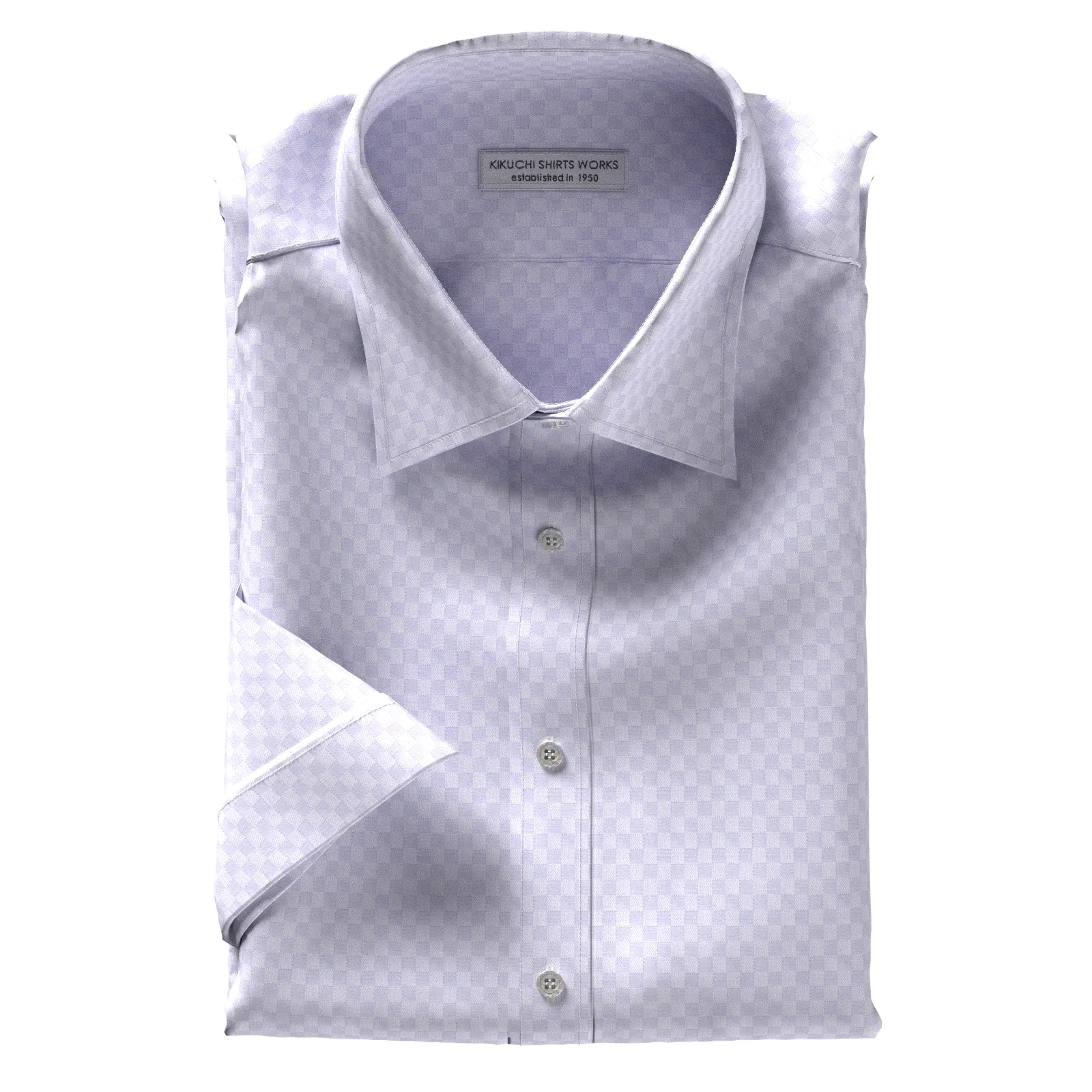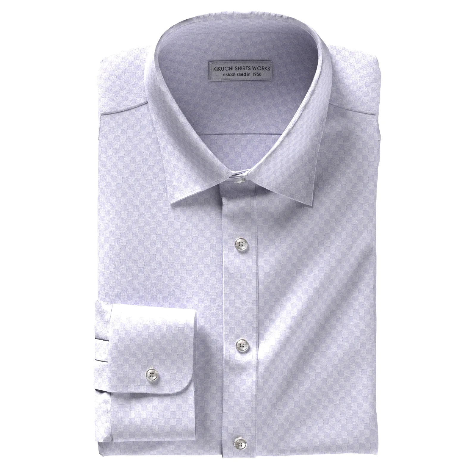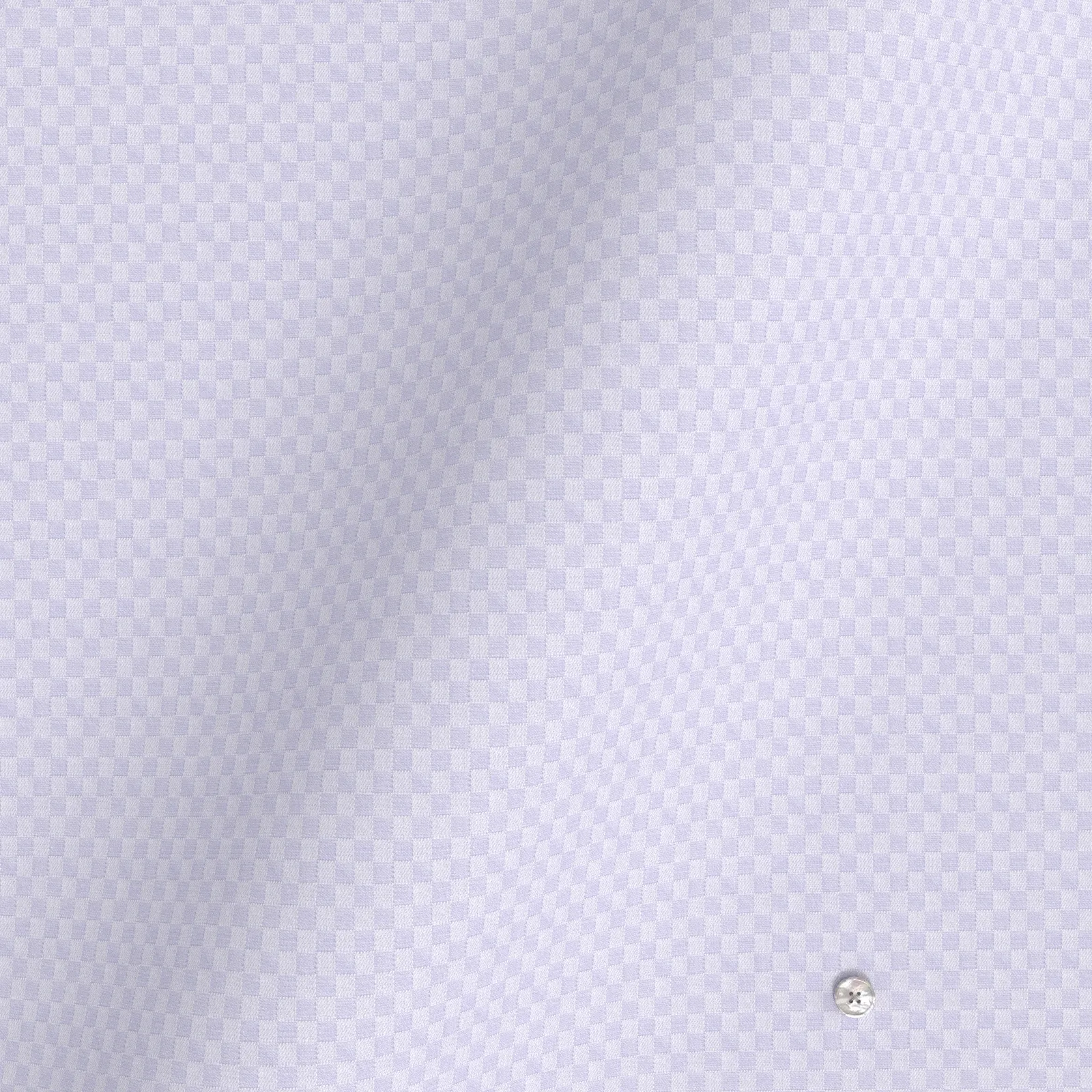光沢感のあるパープルのチェッカードビー柄の綿100%イージーケア素材です。家庭洗濯+軽いアイロンがけですっきり・きっちりと着こなせる忙しいビジネスマンにぴったりの素材です。肌触りも綿100%の風合いを損なわない着心地です。