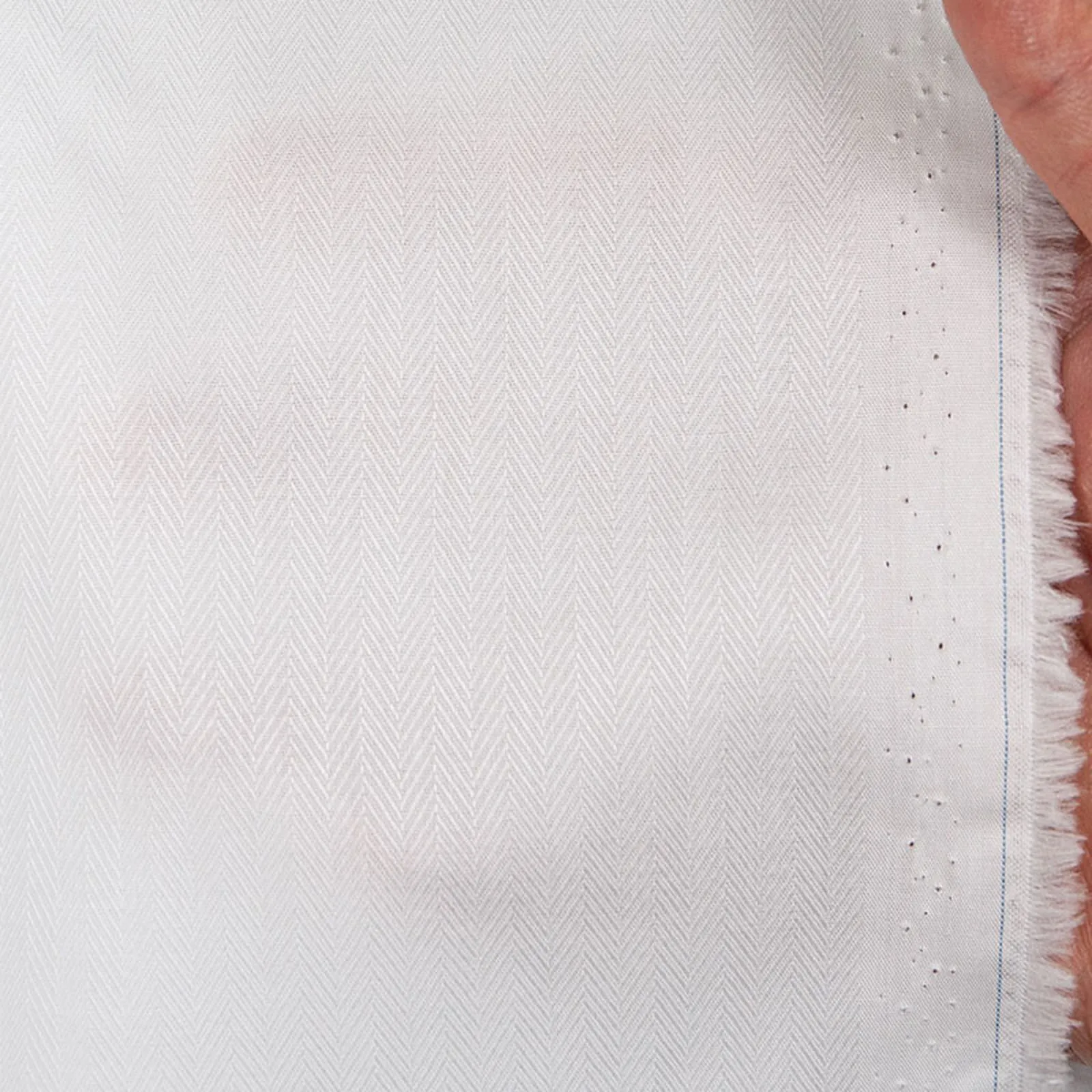 光沢感のあるホワイトの細かなヘリンボーン織の綿100%イージーケア素材です。家庭洗濯+軽いアイロンがけですっきり・きっちりと着こなせる忙しいビジネスマンにぴったりの素材です。肌触りも綿100%の風合いを損なわない着心地です。
