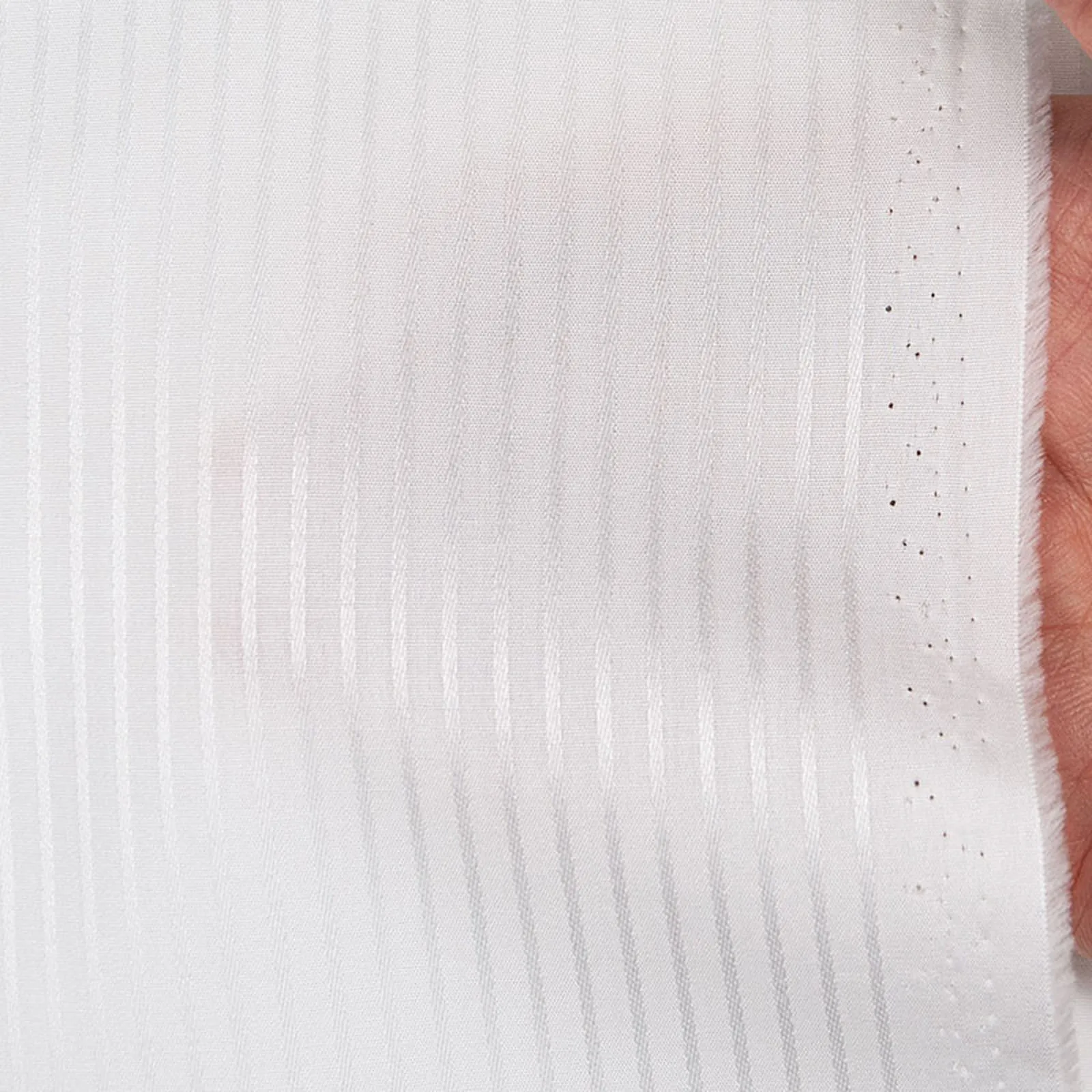 100双糸と上質で光沢感のあるホワイト・ドビーストライプの綿100%イージーケア素材です。家庭洗濯+軽いアイロンがけですっきり・きっちりと着こなせる忙しいビジネスマンにぴったりの素材です。肌触りも綿100%の風合いを損なわない着心地です。